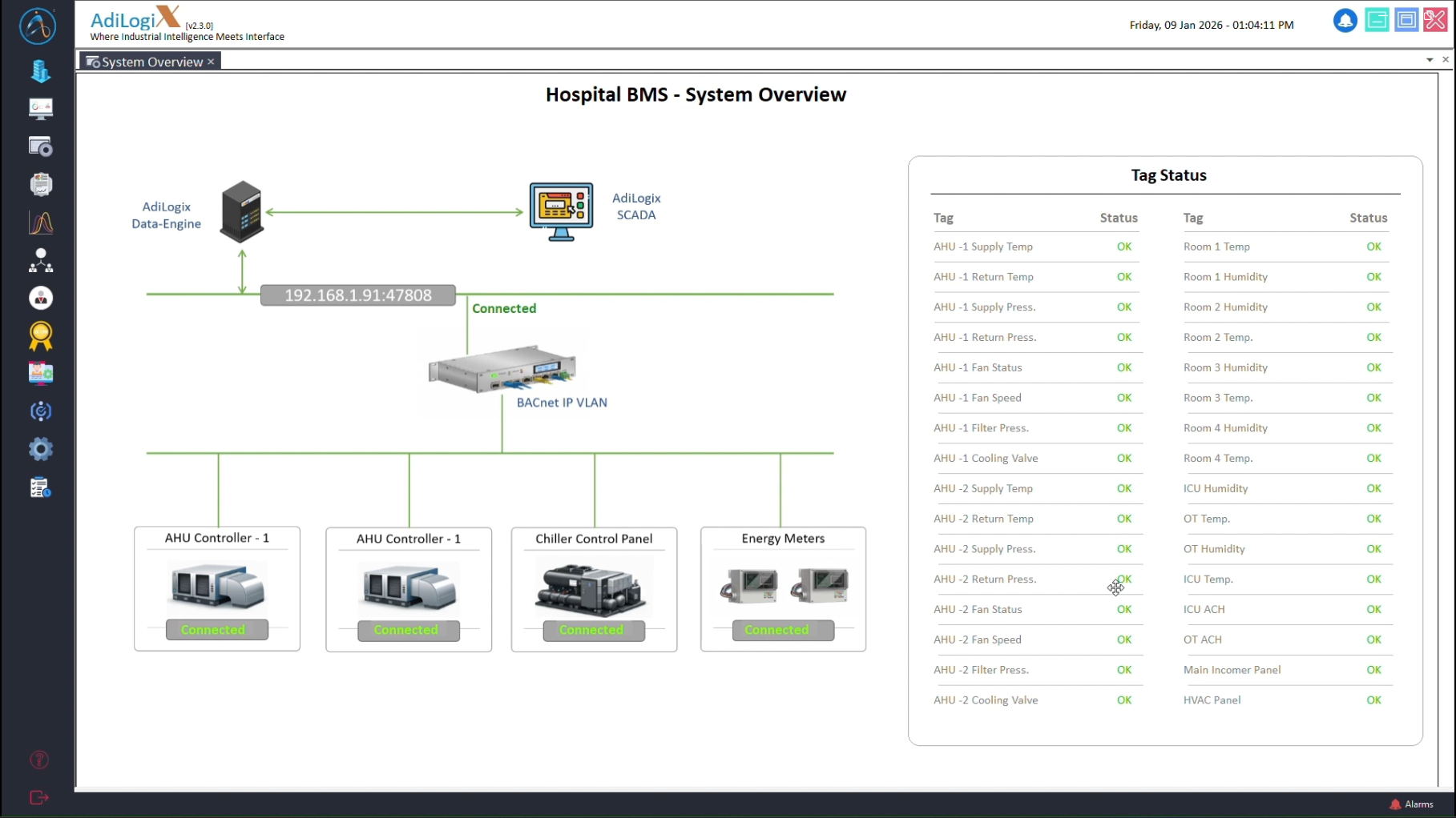 We implemented AdiLogiX SCADA–based Smart Hospital BMS using the BACnet protocol, designed to provide centralized, reliable, and interoperable building automation for healthcare facilities: